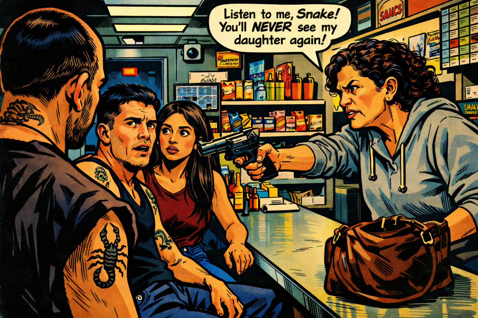 She went inside. Snake was behind the counter and greeted her with a smirk. Not a smile.